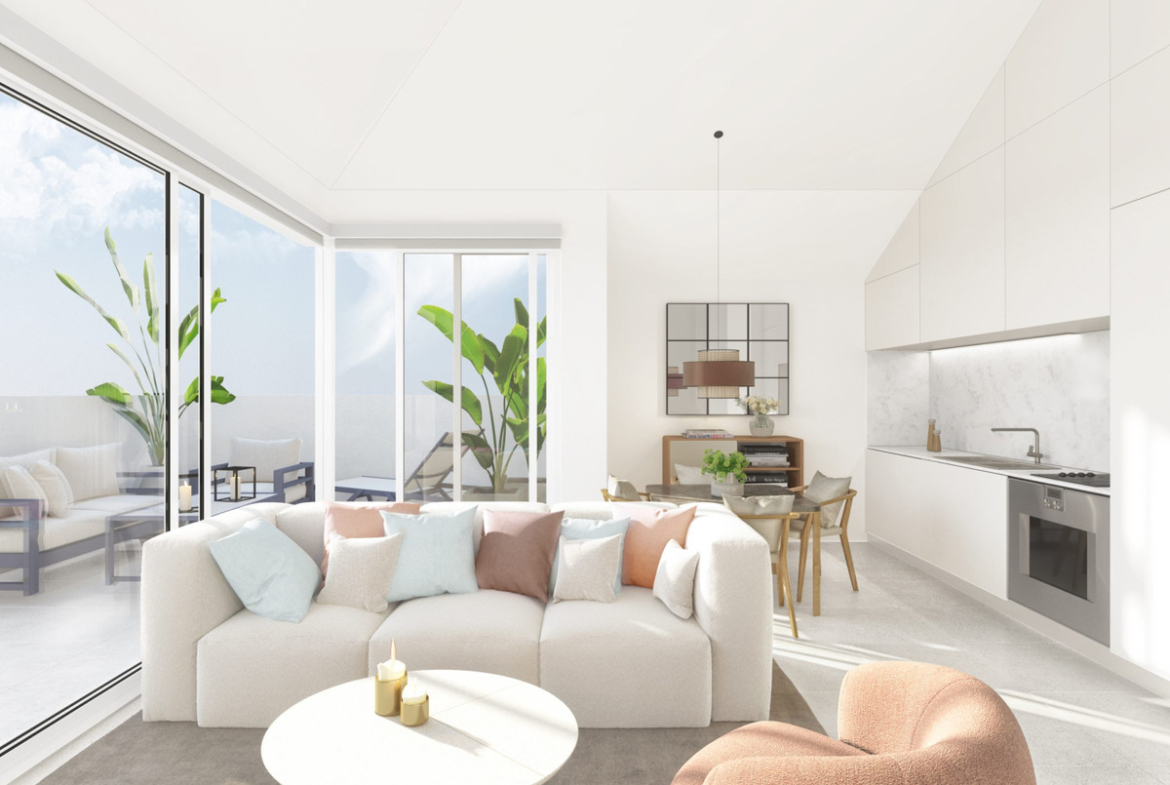 The dining, living, and kitchen areas form a single open space that integrates seamlessly into each home, reinforcing the sense of space and openness that this project offers in the heart of Fuengirola.
