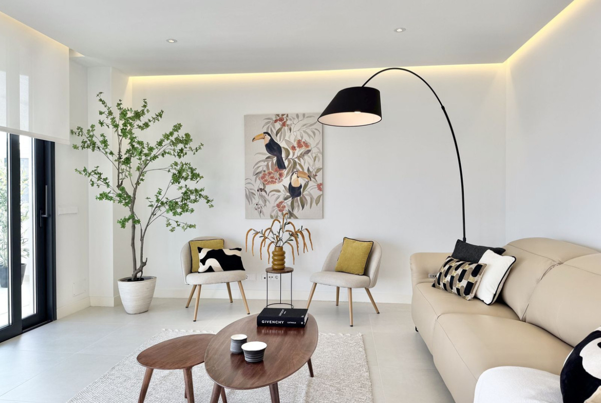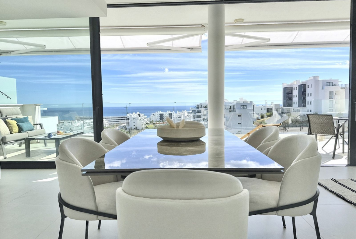This property includes a storage and 2 large parking spaces. The apartment is surrounded by green areas and has fantastic open frontal views onto the green valley leading to the sea. The interior has been tastefully furnished and reveals a feel of space, the interior blending in nicely with the outside terrace. The master bedroom enjoys a private terrace with sea views and a walk-in closet. Extras include both outdoor and indoor electric awnings, underfloor heating in all rooms controlled from your phone via domotics., Neff kitchen appliances. Perimetral ceiling led lighting in sitting room and bedrooms.