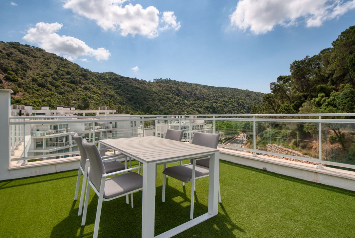 Spacious penthouse in Benahavis with the following layout. The main floor features an open-plan living area leading to a terrace with views over the pool and village. The modern kitchen is fully equipped with top-of-the-line appliances and additional storage.