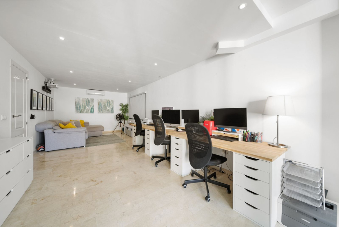 • A large home office creates a functional boundary between work and relaxation.