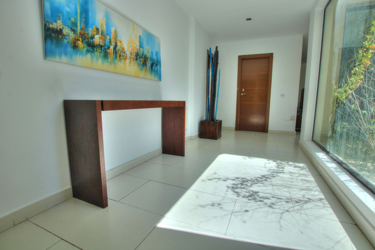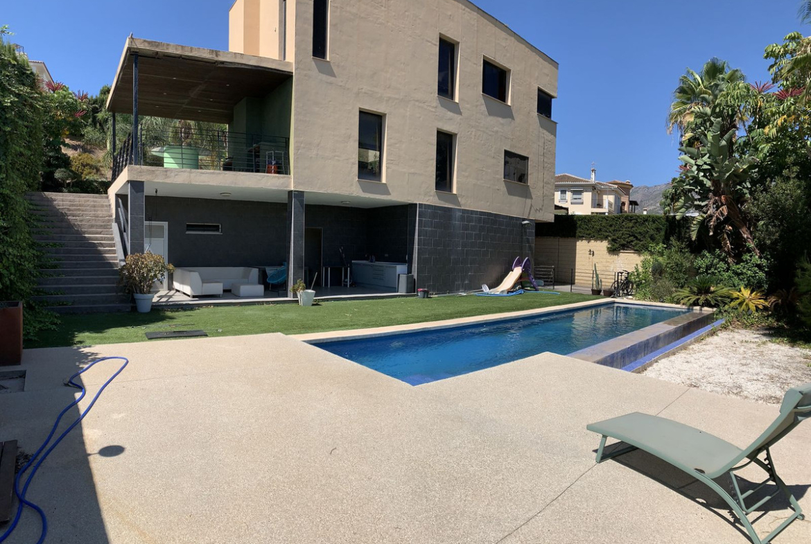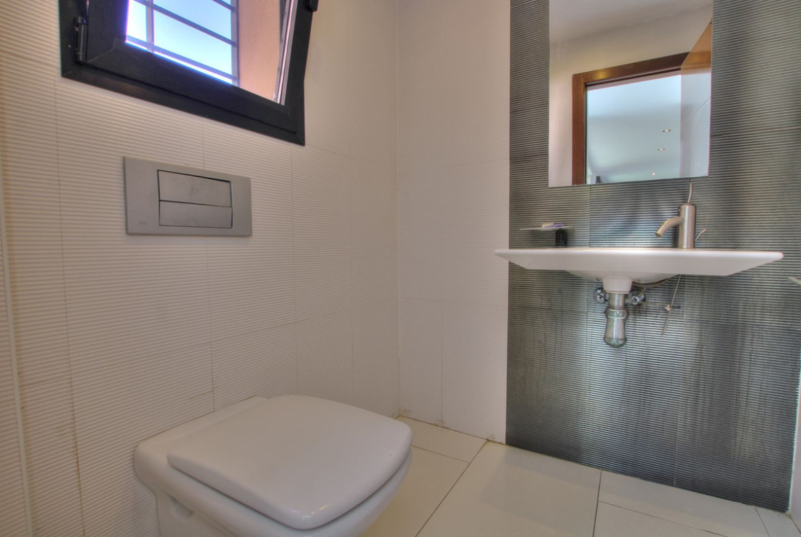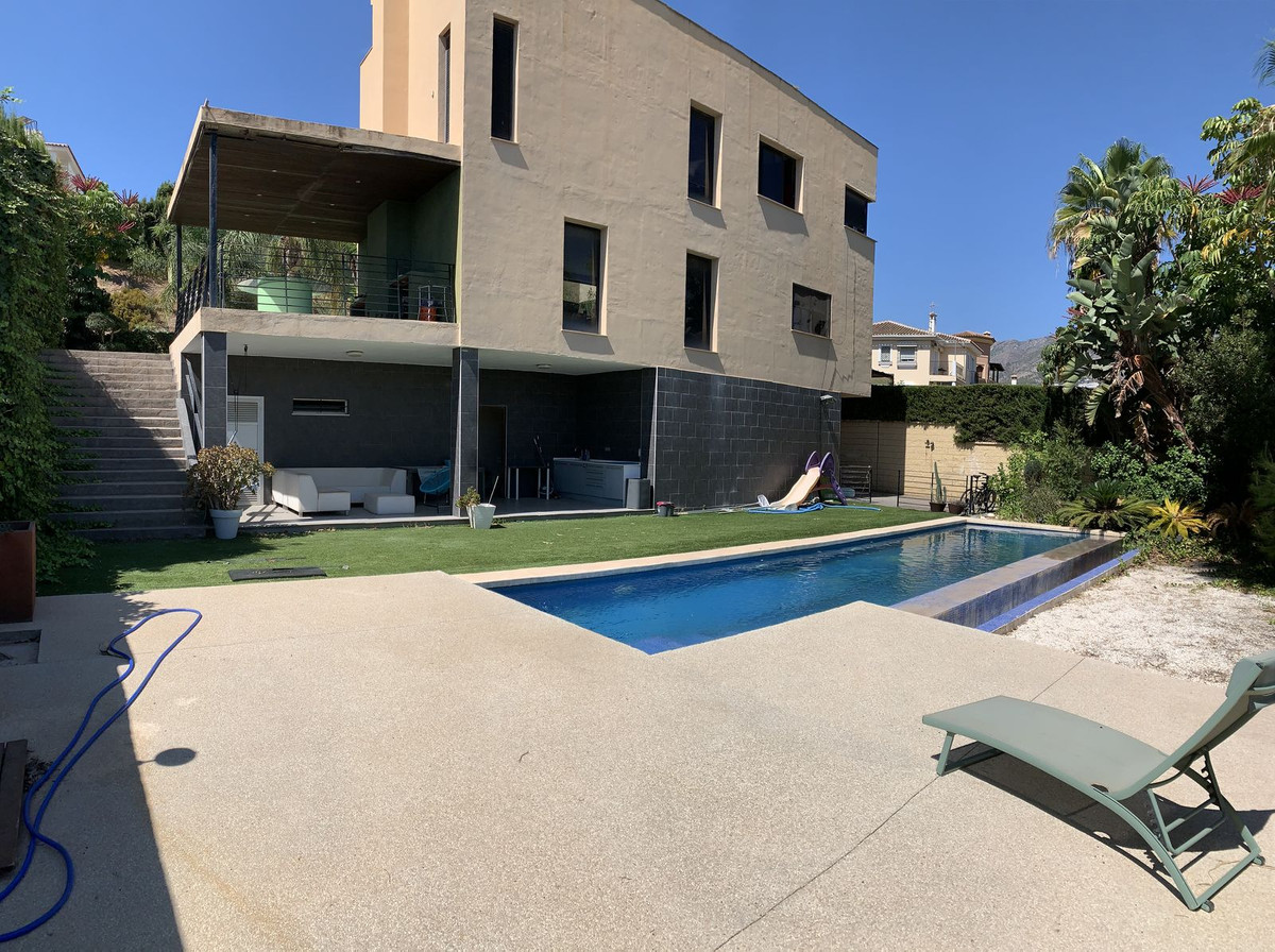 This huge villa with a very large terrace and pool area is located in a very convenient location for routes to Marbella and Malaga. Just 5 minutes drive from Fuengirola and the beach it is located in a residential area and yet has supermarkets close to hand. It is tranquil and the build is modern. It is definitely worth seeing for those people looking for a modern villa to put their stamp on. The pool area and separate apartment with chill out terrace are areas to enjoy during those long summer days. The garage and gym area and relaxation area are all located in the basement. The lower level of the villa comprises the kitchen and then the dining room with access to a huge terrace and an office and relaxing lounge area, which also has access to the terrace and a covered area south facing. The upper level has more bedrooms and bathrooms and the design of bathroom and flooring and all aspects of the villa are modern and spacious.
