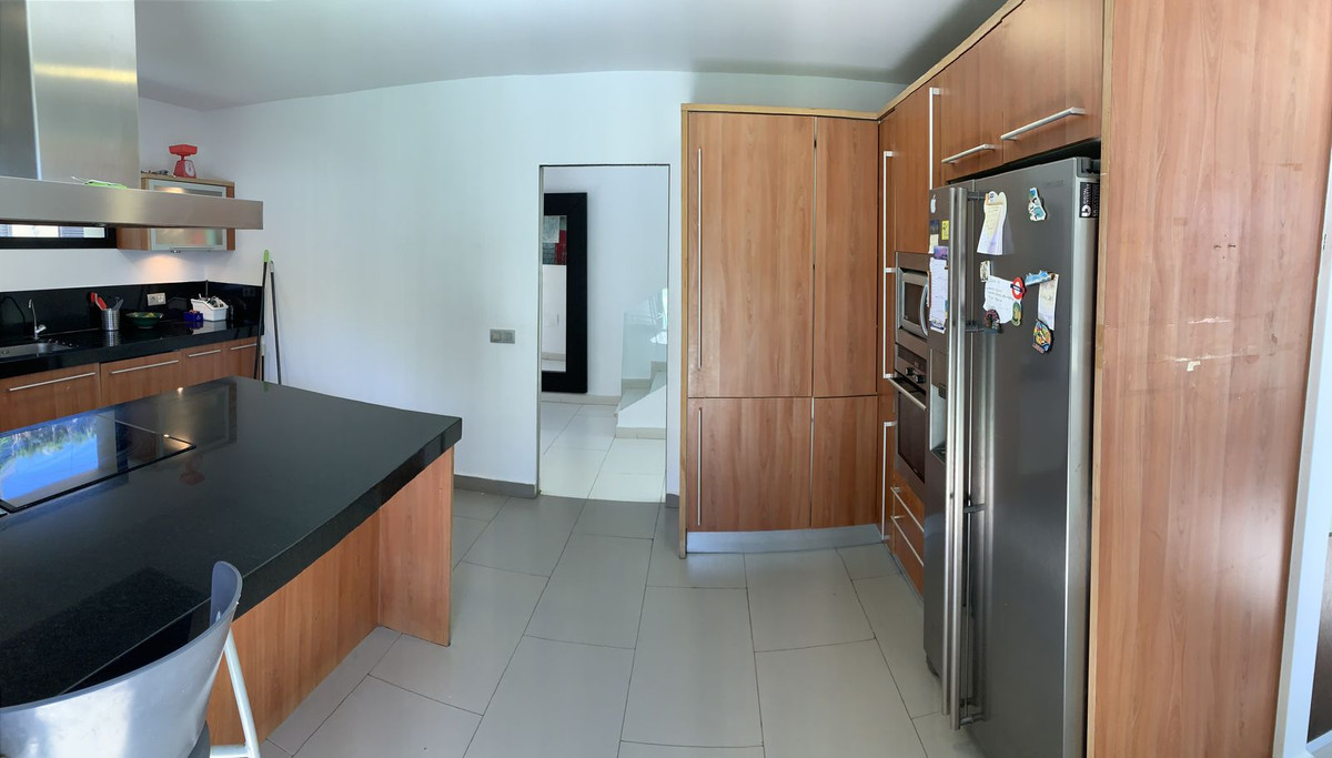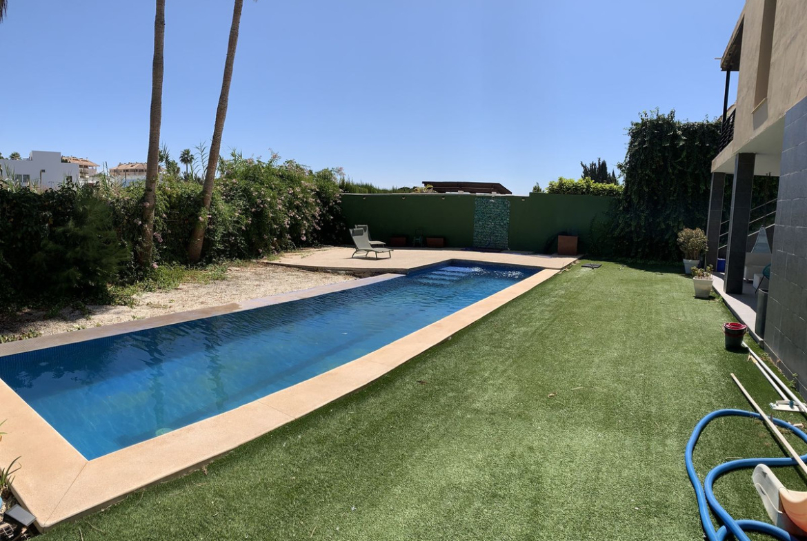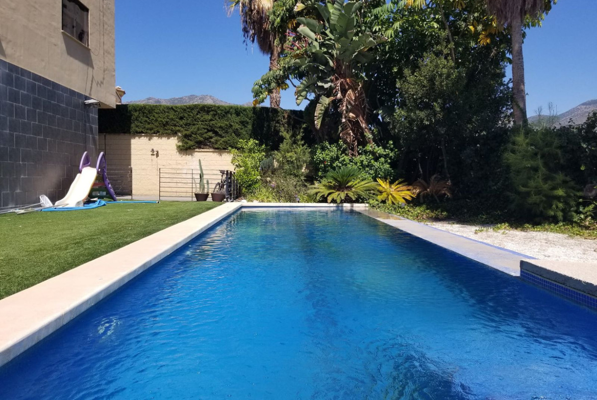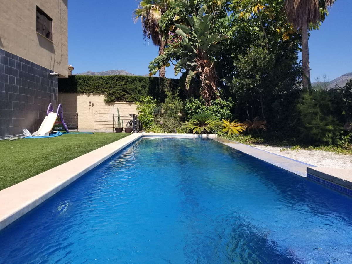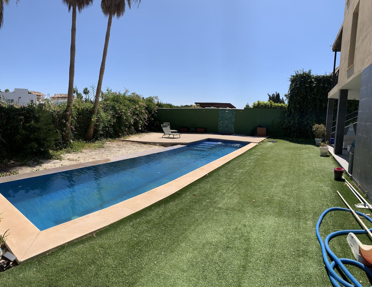 This huge villa with a very large terrace and pool area is located in a very convenient location for routes to Marbella and Malaga. Just 5 minutes drive from Fuengirola and the beach it is located in a residential area and yet has supermarkets close to hand. It is tranquil and the build is modern. It is definitely worth seeing for those people looking for a modern villa to put their stamp on. The pool area and separate apartment with chill out terrace are areas to enjoy during those long summer days. The garage and gym area and relaxation area are all located in the basement. The lower level of the villa comprises the kitchen and then the dining room with access to a huge terrace and an office and relaxing lounge area, which also has access to the terrace and a covered area south facing. The upper level has more bedrooms and bathrooms and the design of bathroom and flooring and all aspects of the villa are modern and spacious.