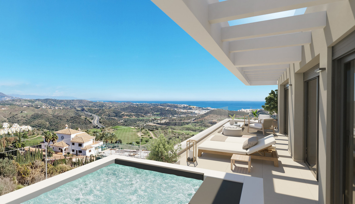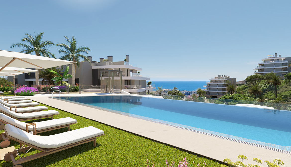 These contemporary apartments and penthouses are spacious and bright with natural sunlight flooding through the floor to ceiling windows. Distributed over several low-rise blocks surrounded by extensive communal gardens they boast high-quality fittings such as Bosch appliances in the kitchens and Hansgrohe taps in the bathrooms. The ground-floor apartments have terraces and private hot tubs, some have their own garden, while the middle-floor apartments have expansive terraces with fabulous views. The penthouses have large terraces leading off the open plan living areas and also have their own hot tubs with the addition of an extensive solarium with absolutely spectacular views. This brand new development truly offers a privileged lifestyle on the Costa del Sol.