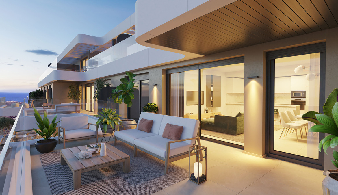 This fantastic new development of stunning contemporary apartments and penthouses with sea views is located just a stone's throw from La Cala de Mijas. The popularity of this beautiful coastal town and the surrounding areas is not surprising. Located on the Costa del Sol this fabulous tourist destination is known for its fabulous sandy beaches, charming old town, and wide range of restaurants, bars, and shops. La Cala de Mijas is also home to several golf courses, one of which is the prestigous Calanova Golf. An ideal spot for outdoor activities like hiking, golf, water sports or simply sitting at a chiringuito on the beachfront enjoying the fantastic climate. Just 25 minutes from Málaga international airport in one direction, and less than 20 minutes from the trendy shops, boutiques and famous night spots of Marbella and Puerto Banus, in the other direction, this amazing development really does boast the perfect location.