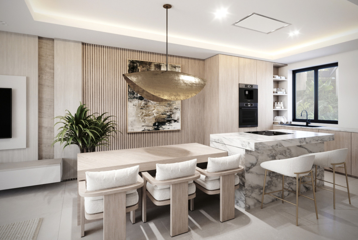 The kitchen is equipped with a stone porcelain countertop and front, matte lacquered or wood-finished doors and drawer fronts, and exposed shelves in an oak finish. A large island presides over the open space where the kitchen, living room and dining room are located in a functional and integrative space.